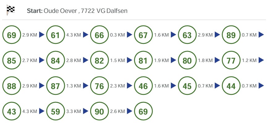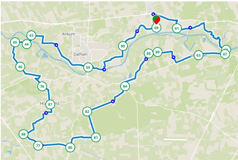 Iets van de route af nabij 59: bekijk in Dalfsen aan de molenstraat de Westermolen, verken de kenmerkende Blauwe Bogenbrug, verwonder je over de ‘Zwevende Kei’ aan de overzijde van de brug nabij Grand Café het oude Station en keer dan weer terug op de route, via 59 naar het buitengebied van Dalfsen richting 90 naar het eindpunt bij 69.